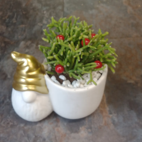 Small Ceramic White Gnome with a Golden Hat Next to a White Ceramic Pot